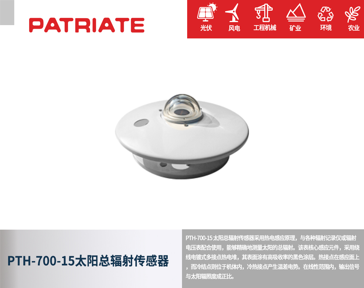 如果您所在的行業(yè)需要精準(zhǔn)測量太陽輻射能量,無論是提升能源利用效率,還是保障生產(chǎn)運(yùn)營安全,PTH-700-15 總輻射傳感器都是您的理想之選。它憑借專業(yè)的技術(shù)和可靠的性能,成為各行業(yè)信賴的 “陽光參謀”,選擇 PTH-700-15,就是選擇更精準(zhǔn)、更高效的能源利用與生產(chǎn)運(yùn)營。